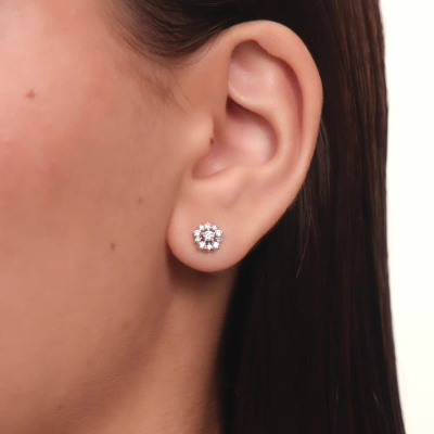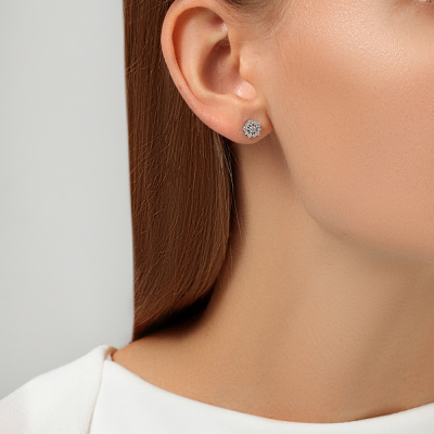 Серьги с 2 бриллиантами природными, 0.14 карат, огранка круг 57 граней, цвет 3, чистота 6, тип огранки А; 10 бриллиантами природными, 0.22 карат, огранка круг 57 граней, цвет 3, чистота 6, тип огранки А; 10 бриллиантами природными, 0.08 карат, огранка круг 17 граней, цвет 2, чистота 2, тип огранки Б; Белое золото 585 пробы.