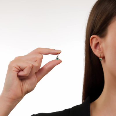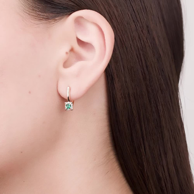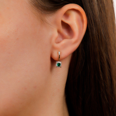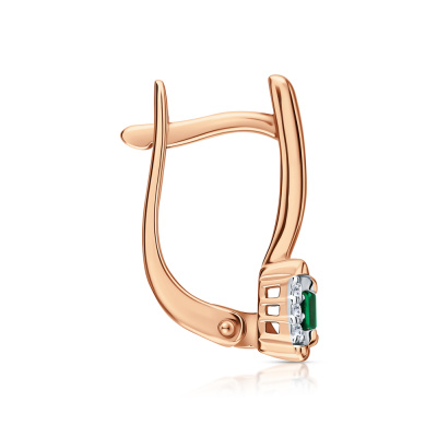Серьги с 24 бриллиантами природными, 0.08 карат, огранка круг 17 граней, цвет 2, чистота 2, тип огранки А; 2 гидротермальными изумрудами, 0.24 карат; Розовое золото 585 пробы.