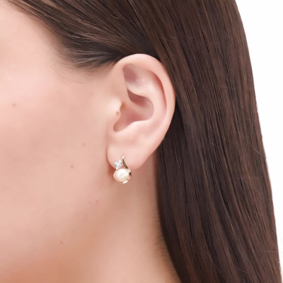 Серьги с 4 бриллиантами природными, 0.03 карат, огранка круг 57 граней, цвет 3, чистота 6, тип огранки А; 2 топазами свисс природными, 0.34 карат; 2 жемчугами пресноводными культ.белыми; Розовое золото 585 пробы.