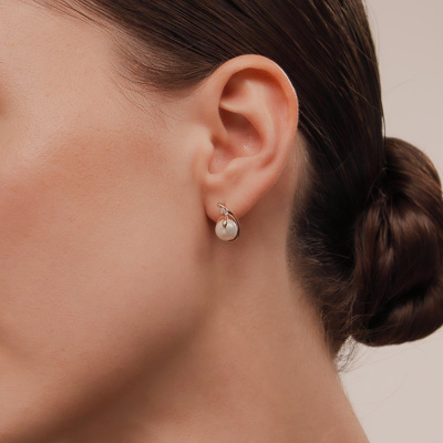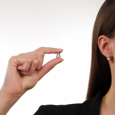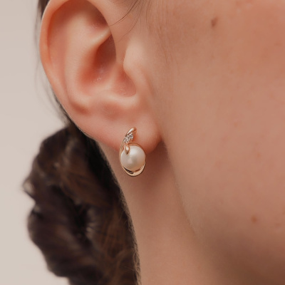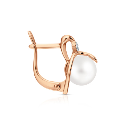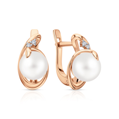 Серьги с 4 бриллиантами природными, 0.03 карат, огранка круг 57 граней, цвет 3, чистота 6, тип огранки А; 2 топазами свисс природными, 0.32 карат; 2 жемчугами пресноводными культ.белыми; Розовое золото 585 пробы.