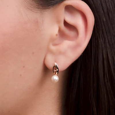 Серьги с 2 бриллиантами природными, 0.008 карат, огранка круг 17 граней, цвет 2, чистота 2, тип огранки А; 2 жемчугами пресноводными культ.белыми; Розовое золото 585 пробы.
