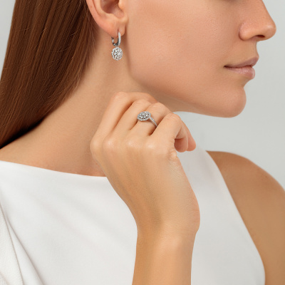 Серьги с 2 бриллиантами природными, 0.19 карат, огранка круг 57 граней, цвет 3, чистота 6, тип огранки А; 16 бриллиантами природными, 0.44 карат, огранка круг 57 граней, цвет 3, чистота 6, тип огранки А; 58 бриллиантами природными, 0.33 карат, огранка круг 57 граней, цвет 3, чистота 6, тип огранки А; 4 бриллиантами природными, 0.01 карат, огранка круг 17 граней, цвет 2, чистота 2, тип огранки А; Белое золото 585 пробы.