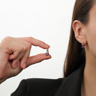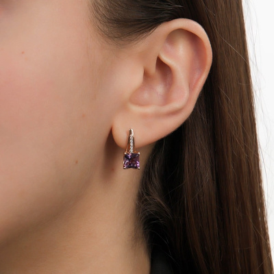 Серьги с 10 бриллиантами природными, 0.04 карат, огранка круг 17 граней, цвет 2, чистота 2, тип огранки А; 2 аметистами природными, 2.02 карат; Розовое золото 585 пробы.