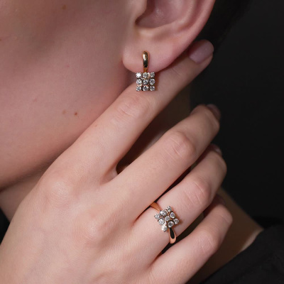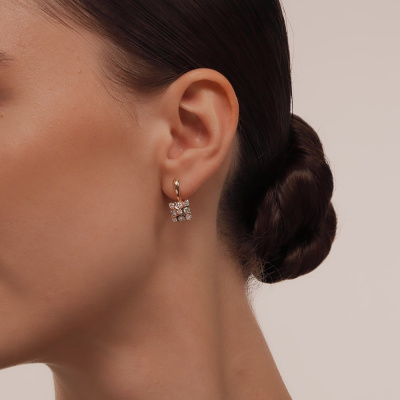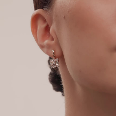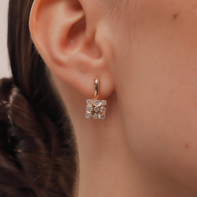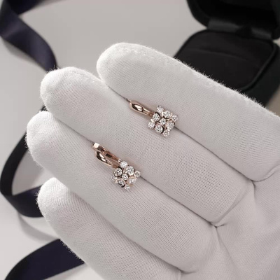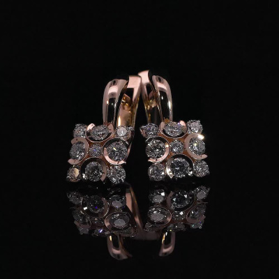 Серьги с 8 бриллиантами природными, 0.63 карат, огранка круг 57 граней, цвет 3, чистота 6, тип огранки А; 8 бриллиантами природными, 0.41 карат, огранка круг 57 граней, цвет 3, чистота 6, тип огранки А; 2 бриллиантами природными, 0.07 карат, огранка круг 57 граней, цвет 3, чистота 6, тип огранки А; Розовое золото 585 пробы.