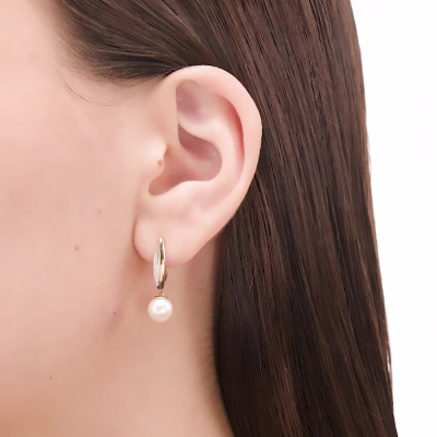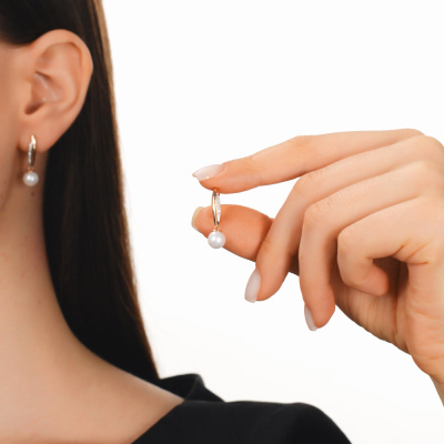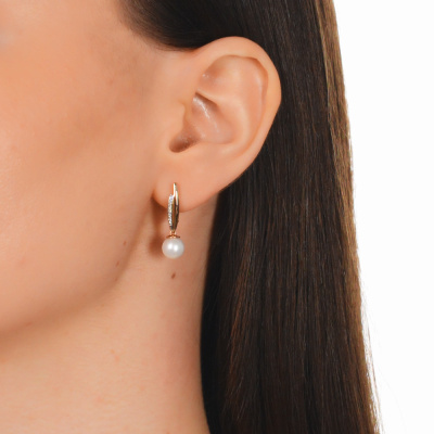 Серьги с 18 бриллиантами природными, 0.05 карат, огранка круг 17 граней, цвет 2, чистота 2, тип огранки Б; 2 жемчугами пресноводными культ.белыми; Розовое золото 585 пробы.