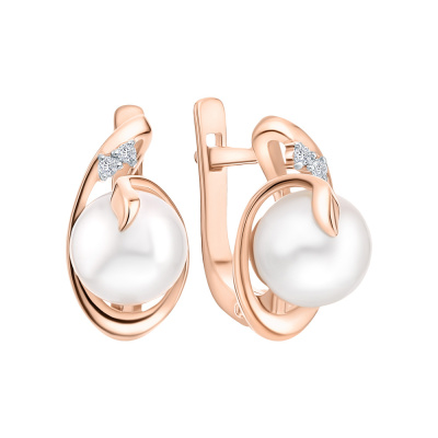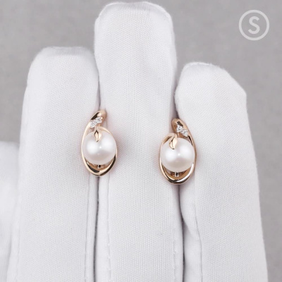 Серьги с 4 бриллиантами природными, 0.02 карат, огранка круг 17 граней, цвет 2, чистота 2, тип огранки А; 2 жемчугами пресноводными культ.белыми, 4.95 карат; Розовое золото 585 пробы.