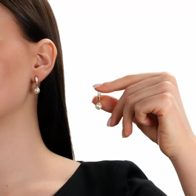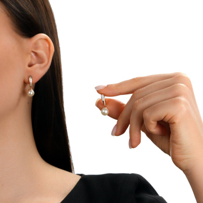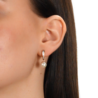 Серьги с 10 бриллиантами природными, 0.04 карат, огранка круг 17 граней, цвет 2, чистота 2, тип огранки А; 2 жемчугами пресноводными культ.белыми; Розовое золото 585 пробы.