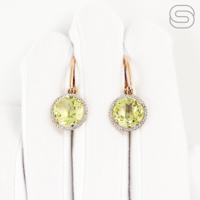 Серьги с 76 бриллиантами природными, 0.17 карат, огранка круг 17 граней, цвет 2, чистота 2, тип огранки Б; 2 кварцами лимонными природными, 7.15 карат; Розовое золото 585 пробы.