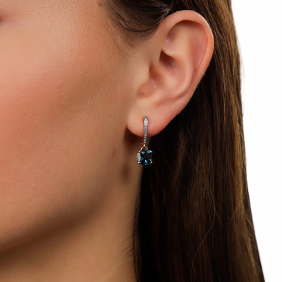Серьги с 20 бриллиантами природными, 0.04 карат, огранка круг 17 граней, цвет 2, чистота 2, тип огранки А; 2 топазами лондон природными, 3.6 карат; Розовое золото 585 пробы.
