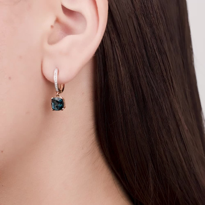 Серьги с 20 бриллиантами природными, 0.04 карат, огранка круг 17 граней, цвет 2, чистота 2, тип огранки А; 2 топазами лондон природными, 3.37 карат; Розовое золото 585 пробы.