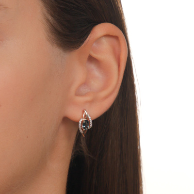 Серьги с 36 бриллиантами природными, 0.14 карат, огранка круг 17 граней, цвет 2, чистота 2, тип огранки А; 2 топазами лондон природными, 1.01 карат; Розовое золото 585 пробы.