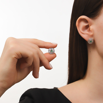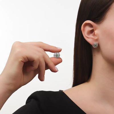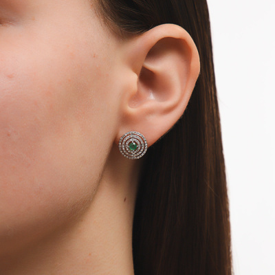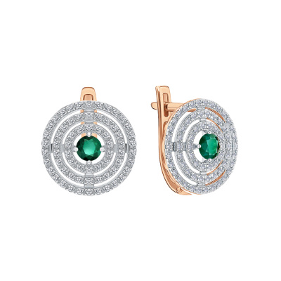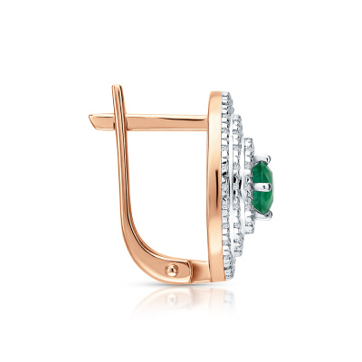 Серьги с 132 бриллиантами природными, 0.35 карат, огранка круг 17 граней, цвет 2, чистота 2, тип огранки А; 2 изумрудами природными, 0.29 карат, цвет 3, чистота 3, тип огранки В; Розовое золото 585 пробы.