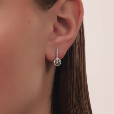 Серьги с 40 бриллиантами природными, 0.15 карат, огранка круг 57 граней, цвет 4, чистота 5, тип огранки А; 2 бриллиантами коньячными природными, 0.02 карат, огранка круг 57 граней, цвет 7, чистота 5, тип огранки А; 12 бриллиантами коньячными природными, 0.09 карат, огранка круг 57 граней, цвет 7, чистота 5, тип огранки А; Белое золото 585 пробы.