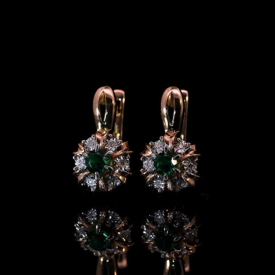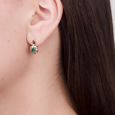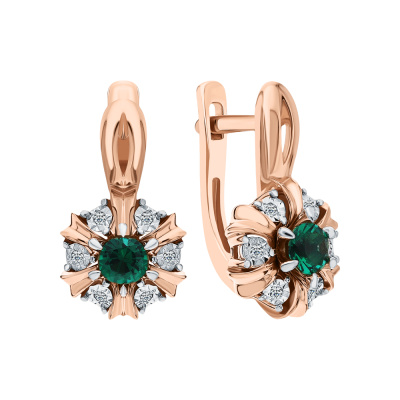 Серьги с 12 бриллиантами природными, 0.04 карат, огранка круг 17 граней, цвет 2, чистота 2, тип огранки А; 2 гидротермальными изумрудами, 0.29 карат; Розовое и белое золото 585 пробы.