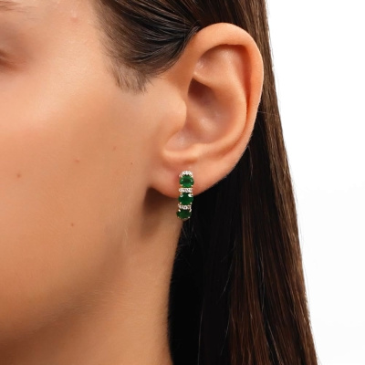 Серьги с 40 бриллиантами природными, 0.33 карат, огранка круг 57 граней, цвет 3, чистота 6, тип огранки А; 6 изумрудами природными, 1.79 карат, цвет 3, чистота 3, тип огранки Б; Желтое золото 585 пробы.