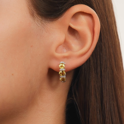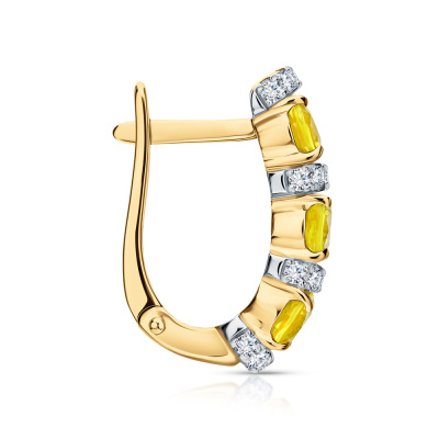 Серьги с 40 бриллиантами природными, 0.33 карат, огранка круг 57 граней, цвет 3, чистота 6, тип огранки А; 6 сапфирами желтыми природными, 2.84 карат; Желтое золото 585 пробы.