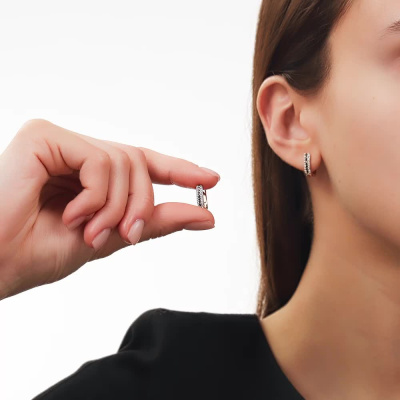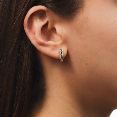 Серьги с 48 бриллиантами природными, 0.09 карат, огранка круг 17 граней, цвет 2, чистота 2, тип огранки А; 16 бриллиантами черными природными облагороженными, 0.12 карат, огранка круг 57 граней, цвет 7, чистота 6, тип огранки А; Розовое золото 585 пробы.