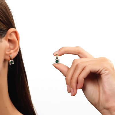 Серьги с 40 бриллиантами природными, 0.08 карат, огранка круг 17 граней, цвет 2, чистота 2, тип огранки Б; 2 гидротермальными изумрудами, 0.54 карат; Желтое золото 585 пробы.