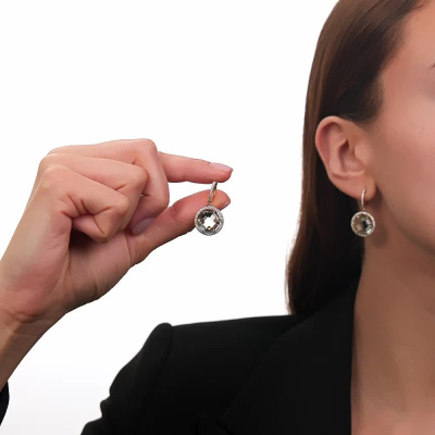 Серьги с 26 бриллиантами природными, 0.12 карат, огранка круг 17 граней, цвет 2, чистота 2, тип огранки А; 82 бриллиантами природными, 0.25 карат, огранка круг 17 граней, цвет 2, чистота 2, тип огранки А; 2 празиолитами природными, 10.69 карат; Желтое золото 585 пробы.