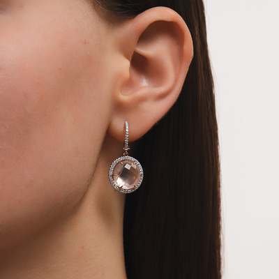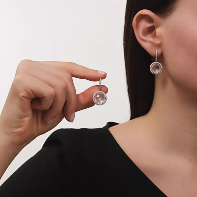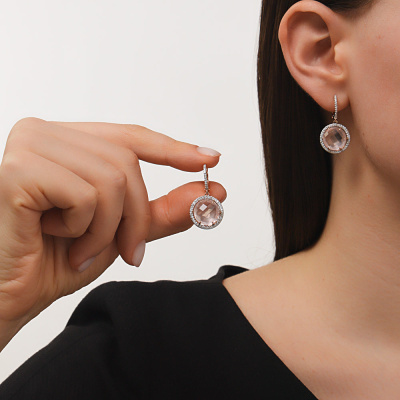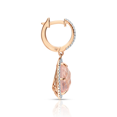 Серьги с 26 бриллиантами природными, 0.1 карат, огранка круг 17 граней, цвет 2, чистота 2, тип огранки А; 82 бриллиантами природными, 0.28 карат, огранка круг 17 граней, цвет 2, чистота 2, тип огранки А; 2 кварцами розовыми природными, 11.55 карат; Розовое золото 585 пробы.