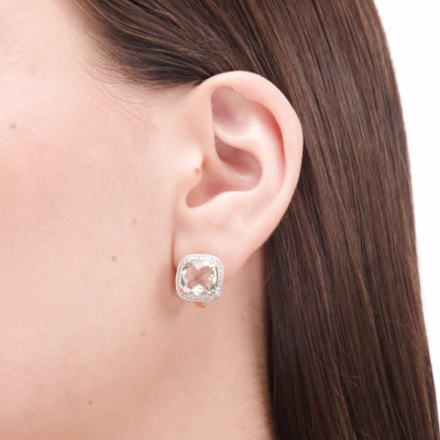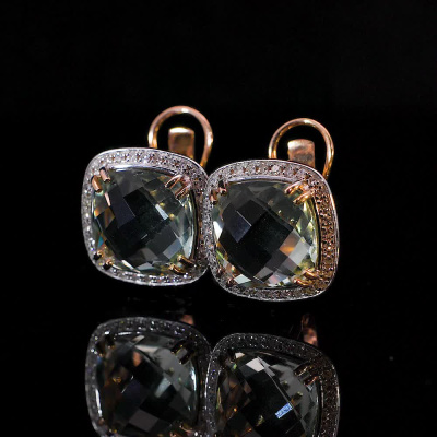 Серьги с 64 бриллиантами природными, 0.19 карат, огранка круг 17 граней, цвет 2, чистота 2, тип огранки А; 2 празиолитами природными, 7.59 карат; Розовое золото 585 пробы.
