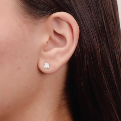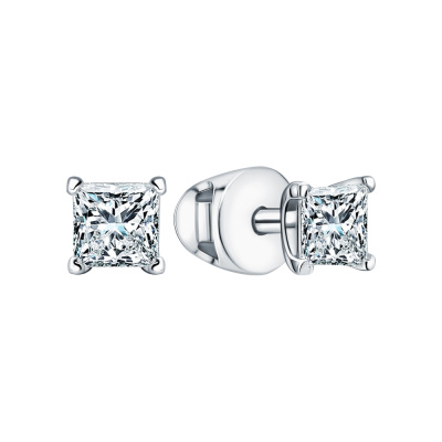 Серьги с 2 бриллиантами природными, 0.81 карат, огранка принцесса 65 граней, цвет 3, чистота 6, тип огранки А; Белое золото 585 пробы.