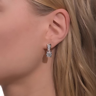Серьги с 8 бриллиантами природными, 0.37 карат, огранка круг 57 граней, цвет 3, чистота 6, тип огранки А; 8 бриллиантами природными, 0.24 карат, огранка круг 57 граней, цвет 3, чистота 6, тип огранки А; 30 бриллиантами природными, 0.2 карат, огранка круг 57 граней, цвет 3, чистота 6, тип огранки А; 4 бриллиантами природными, 0.01 карат, огранка круг 17 граней, цвет 2, чистота 2, тип огранки А; Розовое и белое золото 585 пробы.