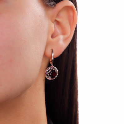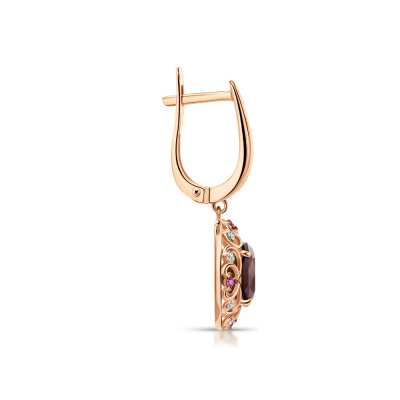 Серьги с 16 бриллиантами природными, 0.07 карат, огранка круг 17 граней, цвет 2, чистота 2, тип огранки А; 2 гранатами природными, 4.36 карат; 8 рубинами природными, 0.08 карат, цвет 2, чистота 2, тип огранки В; Розовое золото 585 пробы.
