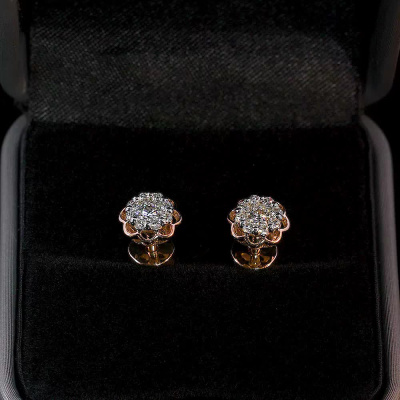 Серьги с 2 бриллиантами природными, 0.12 карат, огранка круг 57 граней, цвет 3, чистота 6, тип огранки А; 16 бриллиантами природными, 0.2 карат, огранка круг 57 граней, цвет 3, чистота 6, тип огранки А; Розовое и белое золото 585 пробы.