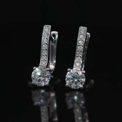 Серьги с 2 бриллиантами природными, 1.22 карат, огранка круг 57 граней, цвет 5, чистота 8, тип огранки А; 14 бриллиантами природными, 0.1 карат, огранка круг 57 граней, цвет 3, чистота 6, тип огранки А; Платина 950 пробы.