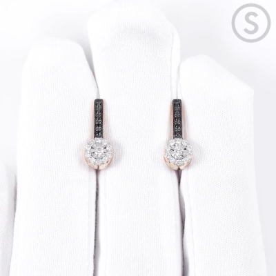 Серьги с 2 бриллиантами природными, 0.06 карат, огранка круг 57 граней, цвет 3, чистота 6, тип огранки А; 20 бриллиантами природными, 0.15 карат, огранка круг 57 граней, цвет 3, чистота 6, тип огранки А; 10 бриллиантами черными природными облагороженными, 0.04 карат, огранка круг 57 граней, цвет 7, чистота 6, тип огранки А; Розовое золото 585 пробы.