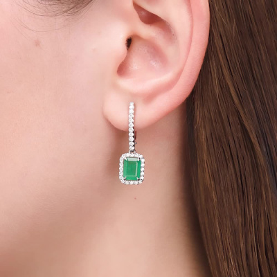 Серьги с 20 бриллиантами природными, 0.26 карат, огранка круг 57 граней, цвет 3, чистота 6, тип огранки А; 40 бриллиантами природными, 0.32 карат, огранка круг 57 граней, цвет 3, чистота 6, тип огранки А; 2 изумрудами природными, 2.88 карат, цвет 3, чистота 3, тип огранки Б; Белое золото 585 пробы.