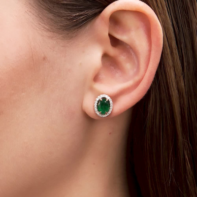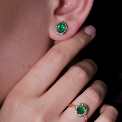 Серьги с 44 бриллиантами природными, 0.24 карат, огранка круг 57 граней, цвет 3, чистота 6, тип огранки А; 2 изумрудами природными, 2.01 карат, цвет 4, чистота 3, тип огранки Б; Розовое золото 585 пробы.