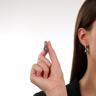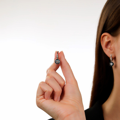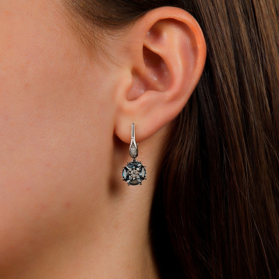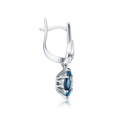 Серьги с 8 бриллиантами природными, 0.02 карат, огранка круг 17 граней, цвет 2, чистота 2, тип огранки Б; 22 бриллиантами природными, 0.04 карат, огранка круг 17 граней, цвет 2, чистота 2, тип огранки Б; 8 топазами лондон природными, 2.18 карат; 2 топазами бесцветными природными, 0.15 карат; Белое золото 585 пробы.