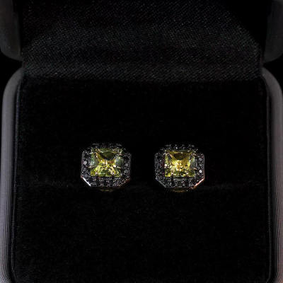 Серьги с 2 кварцами лимонными природными, 1.27 карат; 40 бриллиантами черными природными облагороженными, 0.17 карат, огранка круг 57 граней, цвет 7, чистота 6, тип огранки А; Желтое золото 585 пробы.