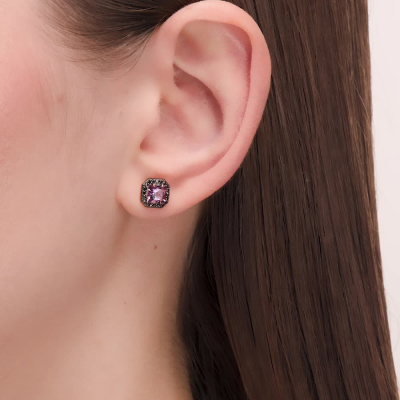 Серьги с 2 аметистами природными, 1.08 карат; 40 бриллиантами черными природными облагороженными, 0.18 карат, огранка круг 57 граней, цвет 7, чистота 6, тип огранки А; Розовое золото 585 пробы.