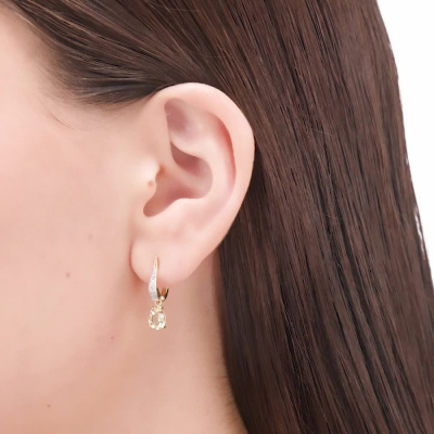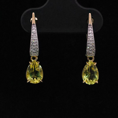 Серьги с 14 бриллиантами природными, 0.04 карат, огранка круг 17 граней, цвет 2, чистота 2, тип огранки Б; 14 бриллиантами природными, 0.02 карат, огранка круг 17 граней, цвет 2, чистота 2, тип огранки Б; 2 кварцами лимонными природными, 1.25 карат; Желтое золото 585 пробы.
