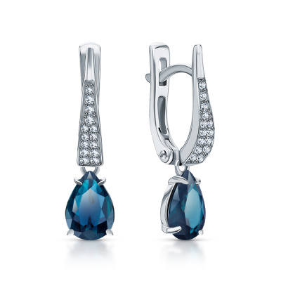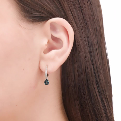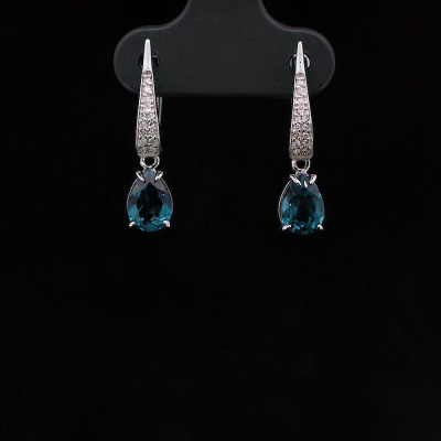 Серьги с 14 бриллиантами природными, 0.04 карат, огранка круг 17 граней, цвет 2, чистота 2, тип огранки А; 14 бриллиантами природными, 0.02 карат, огранка круг 17 граней, цвет 2, чистота 2, тип огранки А; 2 топазами лондон природными, 1.49 карат; Белое золото 585 пробы.