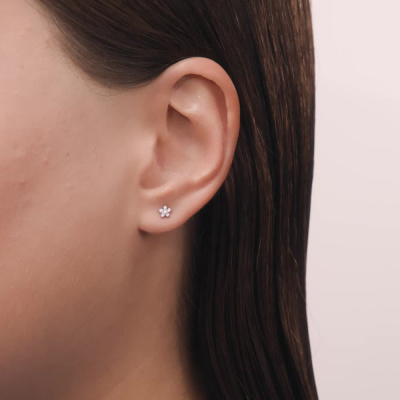 Серьги с 2 бриллиантами природными, 0.02 карат, огранка круг 57 граней, цвет 4, чистота 6, тип огранки А; 10 бриллиантами природными, 0.07 карат, огранка круг 57 граней, цвет 4, чистота 6, тип огранки А; Белое золото 585 пробы.
