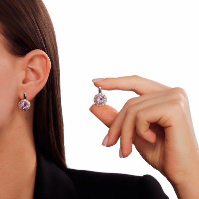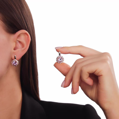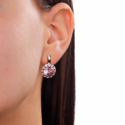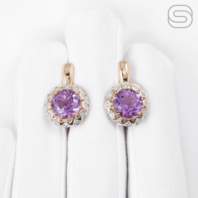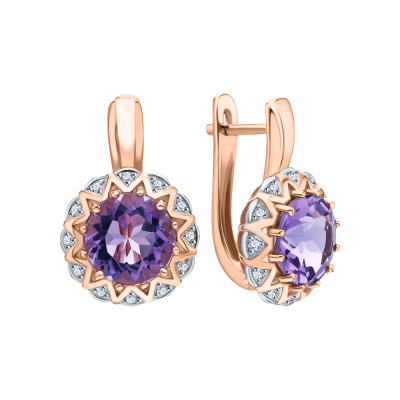 Серьги с 24 бриллиантами природными, 0.17 карат, огранка круг 17 граней, цвет 2, чистота 2, тип огранки А; 2 аметистами природными, 4.86 карат; Розовое золото 585 пробы.