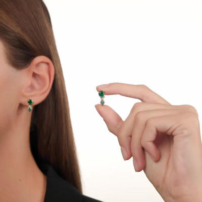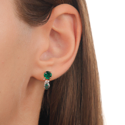 Серьги с 2 бриллиантами природными, 0.005 карат, огранка круг 17 граней, цвет 2, чистота 2, тип огранки А; 22 бриллиантами природными, 0.03 карат, огранка круг 17 граней, цвет 2, чистота 2, тип огранки А; 2 гидротермальными изумрудами, 1.6 карат; 4 гидротермальными изумрудами, 0.08 карат; Розовое золото 585 пробы.
