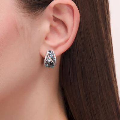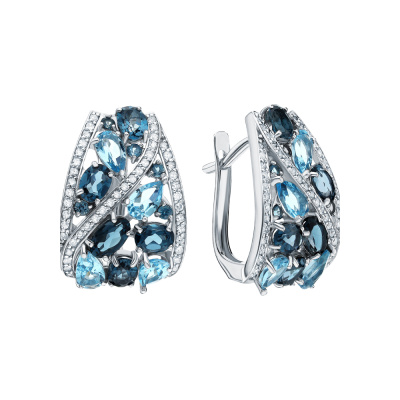 Серьги с 94 бриллиантами природными, 0.29 карат, огранка круг 17 граней, цвет 2, чистота 2, тип огранки А; 2 топазами лондон природными, 0.51 карат; 8 топазами свисс природными, 1.96 карат; 8 топазами лондон природными, 1.57 карат; 10 топазами лондон природными, 0.19 карат; Белое золото 585 пробы.