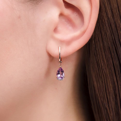 Серьги с 10 бриллиантами природными, 0.04 карат, огранка круг 17 граней, цвет 2, чистота 2, тип огранки А; 2 аметистами природными, 2.32 карат; Розовое золото 585 пробы.