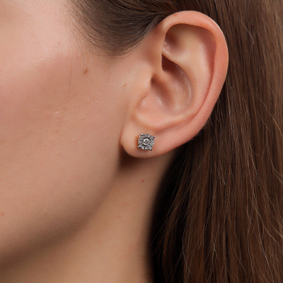 Серьги с 2 бриллиантами природными, 0.11 карат, огранка круг 57 граней, цвет 4, чистота 5, тип огранки А; 24 бриллиантами природными, 0.11 карат, огранка круг 17 граней, цвет 2, чистота 2, тип огранки А; Желтое и белое золото 585 пробы.