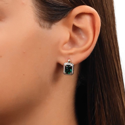 Серьги с 48 бриллиантами природными, 0.21 карат, огранка круг 17 граней, цвет 2, чистота 2, тип огранки А; 2 гидротермальными изумрудами, 2.5 карат; Розовое золото 585 пробы.