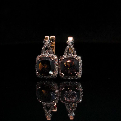 Серьги с 2 кварцами дымчатыми природными, 3.77 карат; 2 бриллиантами коньячными природными, 0.02 карат, огранка круг 57 граней, цвет 7, чистота 5, тип огранки А; 48 бриллиантами коньячными природными, 0.33 карат, огранка круг 57 граней, цвет 7, чистота 5, тип огранки А; 20 бриллиантами коньячными природными, 0.05 карат, огранка круг 57 граней, цвет 7, чистота 5, тип огранки А; Розовое золото 585 пробы.