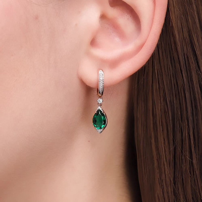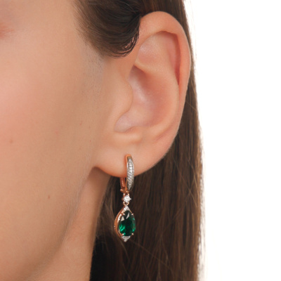 Серьги с 2 бриллиантами природными, 0.08 карат, огранка круг 57 граней, цвет 3, чистота 6, тип огранки А; 60 бриллиантами природными, 0.11 карат, огранка круг 17 граней, цвет 2, чистота 2, тип огранки А; 2 гидротермальными изумрудами, 2.13 карат; Розовое золото 585 пробы.