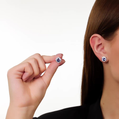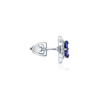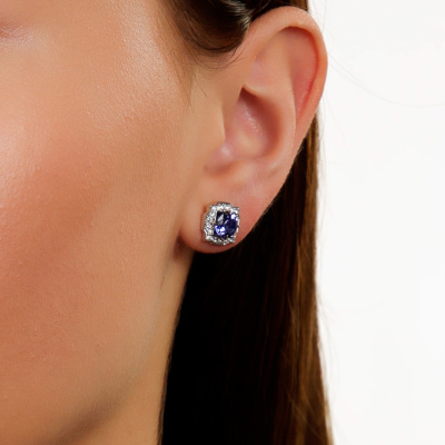 Серьги с 16 бриллиантами природными, 0.15 карат, огранка круг 57 граней, цвет 3, чистота 6, тип огранки А; 24 бриллиантами природными, 0.16 карат, огранка круг 57 граней, цвет 3, чистота 6, тип огранки А; 2 танзанитами природными, 1.59 карат; Белое золото 585 пробы.