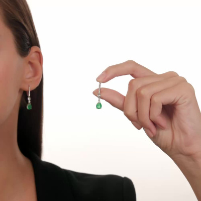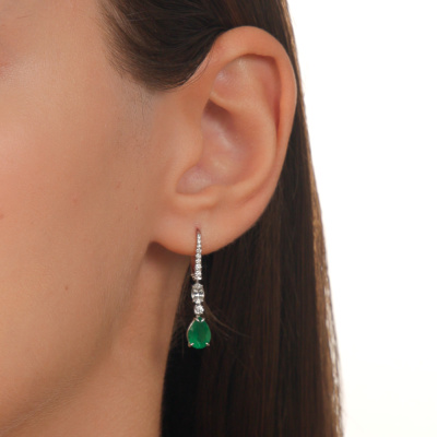 Серьги с 2 бриллиантами природными, 0.07 карат, огранка круг 57 граней, цвет 3, чистота 6, тип огранки А; 4 бриллиантами природными, 0.04 карат, огранка круг 57 граней, цвет 3, чистота 6, тип огранки А; 6 бриллиантами природными, 0.03 карат, огранка круг 57 граней, цвет 3, чистота 6, тип огранки А; 6 бриллиантами природными, 0.02 карат, огранка круг 57 граней, цвет 3, чистота 6, тип огранки А; 2 изумрудами природными, 1.74 карат, цвет 4, чистота 3, тип огранки Б; 2 сапфирами бесцветными природными, 0.54 карат; Белое золото 585 пробы.