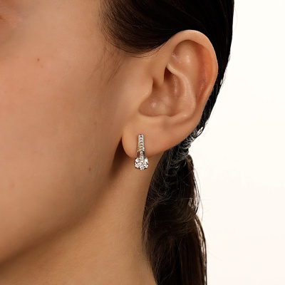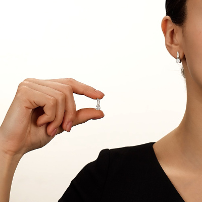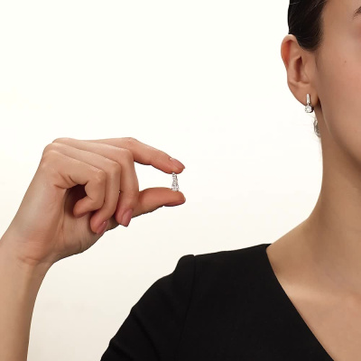 Серьги с 2 бриллиантами природными, 0.11 карат, огранка круг 57 граней, цвет 4, чистота 6, тип огранки А; 12 бриллиантами природными, 0.2 карат, огранка круг 57 граней, цвет 4, чистота 6, тип огранки А; 14 бриллиантами природными, 0.05 карат, огранка круг 17 граней, цвет 2, чистота 2, тип огранки Б; Белое золото 585 пробы.